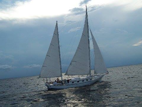 My father had a forty foot sailboat (pictured to the left) and she was very seaworthy. He also was a very good sailor and loved the sea and had no fear of the ocean. While we were on a sailing vacation when I was about ten one day he decided to avoid the afternoon storms that would roll in from the Gulf of Mexico and this time he would head out and go around the storm as to avoid spending the afternoons anchored or at a dock. We ended up in the middle of the storm far out in the Gulf when the storm came upon us. I was terrified.