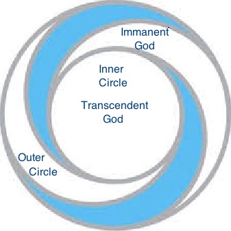 Plato in his Book Ten of The Laws, suggests that God is both transcendent and immanent using the analogy of circular motion, combining the notion of change on the periphery with the constancy of a fixed center, in order to illustrate the action of one God. While one aspect of God toils immanently within the world of change (illustrated to the left on the outer circle), another remains constant and unwavering in a state of transcendence (the inner circle). Plato supplements this analogy with the conclusion: "We must not suppose that God, who is supremely wise, and willing and able to superintend the world, looks to major matters [such as creation of the universe] ... but neglects the minor." Thus, Plato's conceptions of God seem to be a prototype to panentheism.