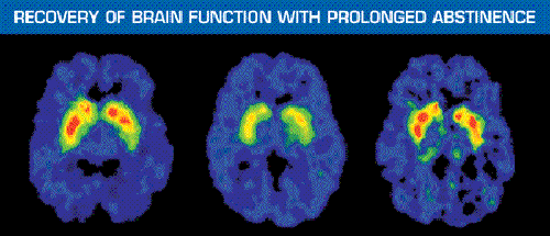 The below picture shows a before and after picture of a drug addict. The left brain is a normal brain with red indicating dopamine, the middle brain shows that dopamine has been severely reduced. The right brain shows what the addicted middle brain looks like after a long period of time free from the addiction. The black areas where there once was gray matter show there was a loss of brain tissue that may never be recovered.