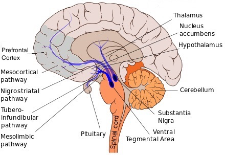 There are four major dopamine pathways that dopamine travels and there are different functions within these pathways. (See above diagram. Click on the picture for an enlarged view.) The most widely accepted theory connected with dopamine function is on the mesolimbic dopamine pathway where it functions as a pleasure/reward neurotransmitter, yet dopamine and its function is far more complicated and far beyond the scope of this article's focus on addictions. Still, it is helpful to know that other pathways convey important information to the brain and body such as: