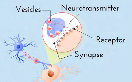 In the normal communication process, dopamine is released by a neuron into the synapse (the small gap between two neurons), where it binds to specialized proteins called dopamine receptors on the neighboring neuron. Neurons absorb these neurotransmitters through receptors. Each neurotransmitter is like a key, and it fits into its own specific receptor, which acts like a lock. In order to maintain balance, the brain is able to change these receptor "locks" to fit other neurotransmitters when there is too much, or not enough, of a certain neurotransmitter in the system. While there are many different kinds of neurotransmitters, each neuron is only designed to produce one or two specific types. Generally, neurons are grouped together based on the neurotransmitters they produce and receive, which is why specific areas of the brain regulate certain functions. Another specialized protein called a transporter removes dopamine from the synapse to be recycled for further use.
