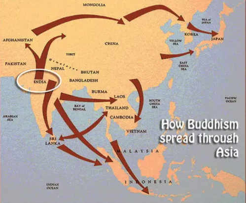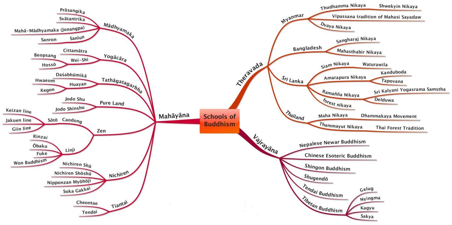 After several centuries, both branches of schools went through many transformations, originating different schools. (See diagram above.) The Theravada school of today emerged from the Sthaviravada line and is the dominant form of Buddhism in Cambodia, Laos, Sri Lanka, Myanmar, and Thailand. The name means "the doctrine of the elders." The Mahasanghika school was found throughout India and present-day Afghanistan, but it eventually disappeared as an ordination tradition. While the Mahasanghika ideas have a strong resemblance to Mahayana Buddhism it is still debated whether Mahasanghika influenced the Mahayana or vice versa. Mahayana means “Great Vehicle” and originated in northern India. This school had a more adaptable approach and was open to doctrinal innovations. Mahayana Buddhism is today the dominant form of Buddhism and dominant in China, Japan, Nepal, Tibet, Mongolia, Korea, and Vietnam.
