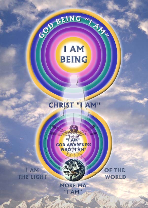 The picture to the right is the I AM Presence chart of the "I AM" Activity. The "I AM" Activity teaches that the "I AM Presence" emanates from the mighty creative fire, the Great Central Sun, the impersonal Source of reality. From this source all creation resulted. In their theology not only does each person have a "Mighty I AM Presence" hovering above them, this I AM Presence is your individual God Presence and one's higher and true self.