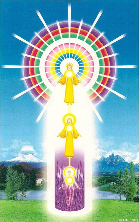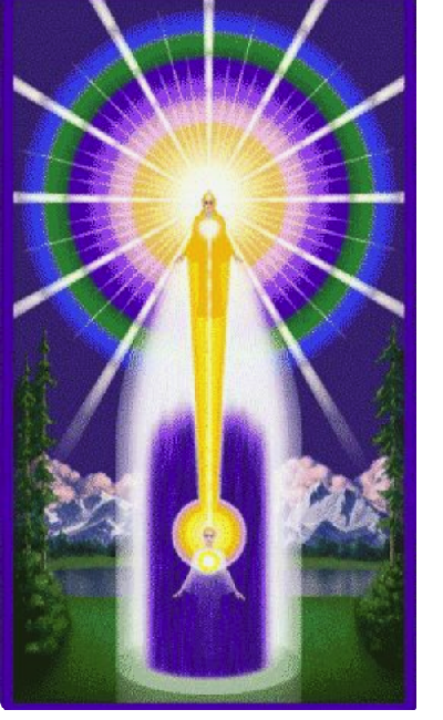 A ray of light (also called the silver cord) extends from the heart of the Presence, through the Holy Christ Self, down through the top of the head, through the area which would correspond to the soft spot on the head of a newborn baby, then enters the heard of the physical body (represented by the lower figure). The Christ Self is said to be the provision which the I AM Presence has made to give the embodying soul assistance in the human world. The Holy Christ Self is then anchored within the heart of every man, woman and child, through the focus of the threefold flame in the heart. The Ballard's St. Germain taught that the ray of light is the substance, energy and intelligence by which the physical body has life and is enabled to move around. Once that silver cord is cut, so-called “death” ensues.